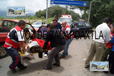 Marisela Díaz Ángeles, de 30 años de edad, quien conducía una camioneta Nissan, color rojo, relató que se dirigía rumbo a Zacapoaxtla, cuando de un camino de terracería salió sin ninguna precaución una camioneta pointer tipo Guayin, color azul marino, invadió su carril y los golpeó en parte derecha de su unidad. Díaz Ángeles resultó con lesiones severas en la pierna derecha y el brazo izquierdo y su madre de 58 años de edad, Ernestina Ángeles Sánchez, tuvo que ser inmovilizada por paramédicos de la cruz roja de esta ciudad, porque presentaba fractura en la pierna izquierda, además de golpes en el rostro, por lo que fueron trasladadas al hospital del Instituto Mexicano del Seguro Social (IMSS) en Zacapoaxtla.