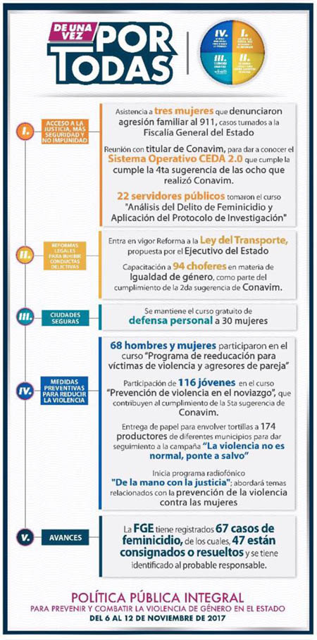 Eje 4 (Medidas preventivas para reducir la violencia): En un esfuerzo conjunto para inhibir la violencia al interior de las familias o en las relaciones de noviazgo, la Secretaría de Salud Estatal (SSEP) en coordinación con el Sistema Estatal DIF, continúa brindando el curso “Programa de reeducación para víctimas de violencia y agresores de pareja”, que esta semana fue impartido a 27 hombres y 41 mujeres. Igualmente, 116 jóvenes participaron en el curso “Prevención de violencia en el noviazgo”. Estas pláticas contribuyen al cumplimiento de la quinta sugerencia de Conavim. Aunado a este esfuerzo de concientización, el gobernador Tony Gali y la directora del Instituto Poblano de las Mujeres (IPM), Nadia Navarro, se reunieron con 174 productores tortilleros de los municipios de Puebla, Huauchinango, Tehuacán, San Pedro Cholula, Zacatlán, Atlixco, Xicotepec y San Andrés Cholula, para dar seguimiento a la campaña “La violencia no es normal, ponte a salvo”, en papel para envolver tortillas. De la misma manera, el Honorable Tribunal Superior de Justicia anunció esta semana la puesta en operación del programa radiofónico "De la mano con la justicia"; que abordará temas relacionados con la prevención de la violencia contra las mujeres en sus diferentes modalidades. La FGE tiene registrados 67 casos de feminicidios, de los cuales, 47 están resueltos y se tiene identificado al probable responsable. En Puebla “De una Vez Por Todas” trabaja por una vida libre de violencia para las mujeres.