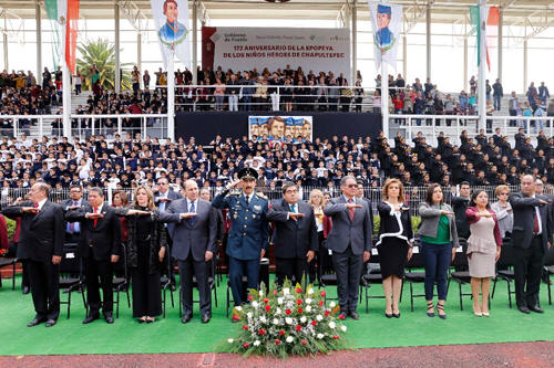 “Hoy valoramos a nuestros héroes y a su ejemplo, de cara a las nuevas batallas del siglo XXI, el combate a la descomposición social, el rescate de los valores, lucha por el bienestar social. Estar hoy ante ustedes, ante mi Alma Mater, el Centro Escolar Niños Héroes de Chapultepec, refleja que la educación y la cultura del esfuerzo hacen posible alcanzar posiciones en la vida y, sobre todo, herramientas para empoderar ciudadanos responsables". En la ceremonia, el encargado de despacho del Centro Escolar Niños Héroes de Chapultepec, Arturo Landero, dijo que la nueva reforma educativa garantiza el desarrollo de todos los alumnos y se comprometió a un servicio de calidad y la promoción de los valores de la democracia. Al finalizar la ceremonia, el titular del ejecutivo, los secretarios de Educación, Melitón Lozano; de Gobernación, Fernando Manzanilla; de Economía, Olivia Salomón; elementos de la 25 Zona Militar, personal docente y alumnos del Centro Escolar hicieron una guardia de honor en la Plaza Cívica del Centro Escolar Niños Héroes de Chapultepec (CENHCH).
