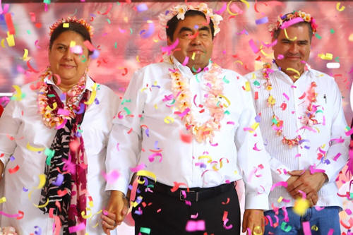 En este encuentro de agradecimiento, el gobernador electo y su esposa Rosario Orozco fueron recibidos por representantes de pueblos originarios quienes les colocaron collares florales y les entregaron una canasta con frutos de la región. A este acto asistieron Óscar Ramírez, representante social; Guadalupe Ramírez, edil de Pahuatlán; Lupita Vargas, edil de Xicotepec, así como el diputado federal Miguel Acundo y Ardelio Vargas, líder regional.