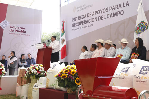 Entrega Miguel Barbosa 5 mil 841 apoyos al campo poblano por un monto de 40 mdp · Reitera el mandatario que el campo es la principal prioridad para su administración. · Afirma subsecretario de Agricultura del Gobierno Federal que a Puebla se extenderá el programa de apoyo de fertilizantes. · A la fecha se han entregado 238 mdp en apoyo a 12 mil productores de 90 municipios: Ana Laura Altamirano. 15 Marzo 2020