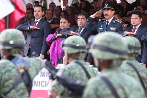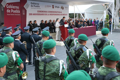 El mandatario estatal rindió los honores correspondientes durante el izamiento de bandera. En su mensaje, Ángel Barroso Díaz, integrante de la sociedad civil, señaló que hoy en Puebla se vive un esfuerzo transformador, con un cambio que pretende ser pacífico. "Hoy en Puebla caja de resonancia del México del Siglo XXI, se vive un esfuerzo transformador, un cambio que pretende ser profundo; pero pacífico", destacó Barroso Díaz. En el acto conmemorativo también estuvieron presentes José Alfredo González Rodríguez, comandante de la XXV Zona Militar; el secretario de Gobierno, Fernando Manzanilla Prieto; el presidente de la Junta de Gobierno y Coordinación Política del Congreso del Estado, Gabriel Biestro Medinilla; el magistrado presidente del Tribunal Superior de Justicia, Héctor Sánchez Sánchez; y la presidenta municipal de Puebla, Claudia Rivera Vivanco.