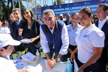 Adicionalmente, agradeció el compromiso del Secretario de Salud, José Narro, con la entidad, por apoyar a los 112 municipios que presentaron afectaciones tras el sismo del 19 de septiembre. Mencionó que como parte de las acciones de prevención en el estado, se realizan exámenes médicos a los infantes para detectar padecimientos hereditarios como la diabetes o el cáncer. La Secretaria de Salud, Arely Sánchez, señaló que en México sólo una de cada tres personas se asea las manos, lo que incrementa el riesgo de contraer padecimientos; por ello, aseguró que el lavado debe promoverse desde la infancia para construir sociedades más sanas. Por su parte, la Secretaria de Educación Pública, Patricia Vázquez, recalcó que existe un trabajo coordinado con la Secretaría de Salud para realizar campañas en las escuelas poblanas que permitan tener estudiantes saludables. El alcalde de Puebla, Luis Banck, reconoció el liderazgo del gobernador Tony Gali y el apoyo de su esposa Dinorah López de Gali, así como el trabajo de alumnos, maestros y padres de familia, para que Puebla siga avanzando en la formación de estos hábitos. Colocan la primera piedra de la unidad de cuidados intensivos neonatales