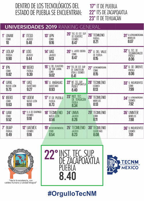 El Periódico EL UNIVERSAL, el Gran Diario de México; el Centro de Investigación, Documentación y Análisis de EL UNIVERSAL (CIDAU) buscan fortalecer la relación que ha mantenido con las Instituciones de Educación Superior que han contribuido al enriquecimiento y crecimiento de la “Guía de las Mejores Universidades” a lo largo de las ediciones que se han elaborado. Es importante mencionar que la metodología utilizada está respaldada por un grupo de académicos y expertos en educación superior. El Tecnológico de Zacapoaxtla se encuentra en el lugar 22 de 36 lugares considerados dentro de las 36 mejores universidades de acuerdo al ranking antes mencionado. Dentro de las Instituciones reconocidas del Estado de Puebla se encuentran: 2 Lugar UDLA 7 Lugar BUAP 10 Lugar IBERO 17 Lugar IT de Puebla 22 Lugar ITS de Zacapoaxtla 23 Lugar IT de TEHUACAN 26 Lugar TECMILENIO PUEBLA 27 Lugar UNIVERSIDAD DEL VALLE DE PUEBLA