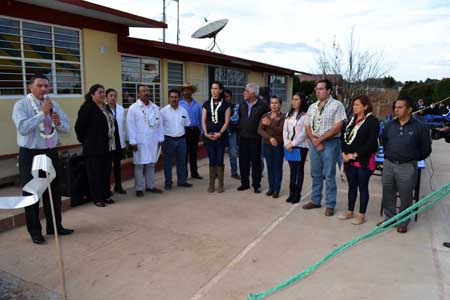 Dentro del programa de inauguración, los integrantes del Ayuntamiento participaron con el izamiento de la bandera blanca que certifica a esta Telesecundaria como Escuela Saludable, gracias a los trabajos del personal de salud en prevención de embarazos en los alumnos de esta institución.