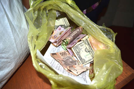 La mujer de 56 años de edad de nombre Sofía Rosas Gómez, fue señalada de manera directa por el robo de un monedero a la altura del cruce de las calles 5 de mayo sur y Brigadier Lobato en donde se encontraron a dos personas discutiendo, hechos por los cuales fue detenida por la policía y llevada a la comandancia de policía, en donde se le encontraron mil 500 pesos en una bolsa de plástico, además de cerca de mil 800 pesos y cuatro billetes de un dólar, escondidos en las mangas de su suéter.