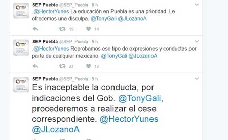 A través de twitter, la SEP en Puebla informó que la conducta de Vega Monroy era “inaceptable” y que por órdenes del gobernador Antonio Gali Fayad se realizaría el cese correspondiente de dicho trabajador.