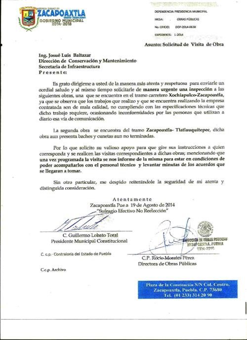 A través de la dirección de obras públicas, la comuna solicitó desde el 19 de agosto a Josué Luis Baltazar, Director de conservación y mantenimiento de la Secretaría, que se realizara una inspección de la obra, porque se detectaron que los trabajos eran de mala calidad y no cumplían con las especificaciones técnicas, por lo que el 21 de agosto, se revisó esta obra por parte del supervisor Jerson Delgado García y se firmó una minuta.