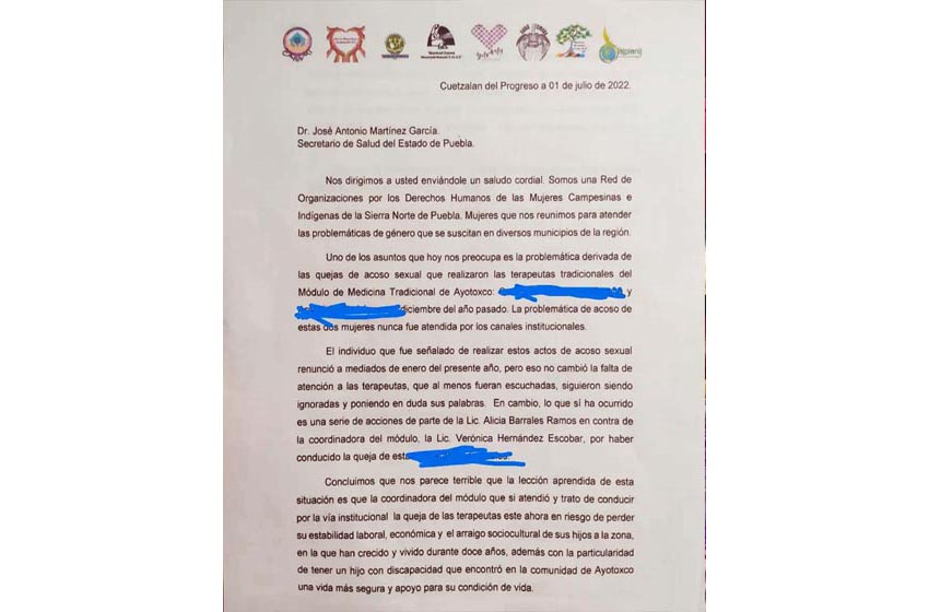 El pasado 1 de julio de 2022, la Red de Organizaciones de Derechos Humanos de las Mujeres Campesinas e Indígenas de la Sierra Norte de Puebla, expuso al titular de la SS, mediante oficio, el caso de dos terapeutas tradicionales que fueron acosadas sexualmente a finales del año pasado.