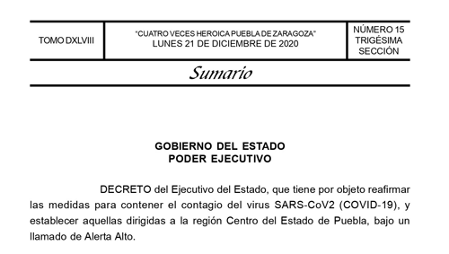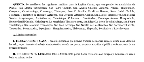 El Gobierno Estatal, dividió el estado en seis regiones para monitorear el comportamiento del Virus Covid 19, para ello separó en la regiones Centro, Centro Oriente, Sur Poniente, Sur Oriente, Norte y Nororiente. En el decreto establecen: “Que es necesario reforzar las medidas y restricciones en el marco de la Emergencia Sanitaria, estas decisiones han sido tomadas en función a la velocidad a la que los casos han venido aumentando en las últimas semanas; las tasas de positividad y detección de casos y, en previsión a la presión que pudiera presentarse sobre los servicios de salud en el Estado”. “Que se estima que una de cada 3 personas que tiene SARS-CoV2 (COVID-19) no presenta síntomas y lo propagará sin darse cuenta y de ahí la necesidad de reforzar, en todo el Estado, las medidas personales que permitan mitigar el riesgo de contagio integradas en la trilogía “Manos-Cara-Espacio”. Que se han definido niveles de alertamiento para las regiones con las que se ha trabajado el semáforo epidemiológico en el Estado de Puebla para definir acciones específicas y diferenciadas. “Que a través de este Decreto se reafirman medidas, y se establecen aquellas que buscan contener el contagio del virus y que están dirigidas exclusivamente a los 45 municipios que conforman la Región Centro, bajo un llamado de Alerta Alto”. Que este es un último llamado total a la mesura, un llamado a no relajar las medidas sanitarias y poder poner un alto al aumento de contagios de una enfermedad que se ha distinguido por traer consigo soledad, angustia y desesperación. Por lo anterior, el propio estado establece que en el resto del estado, no se deben relajar las medidas, pero las restricciones como la venta de bebidas alcohólicas y reducción de horarios en comercios, solo aplican para los 45 municipios señalados, sin embargo, como ocurre actualmente, personas que ni siquiera leen los decretos, dan a conocer notas erróneas y que generan desinformación.