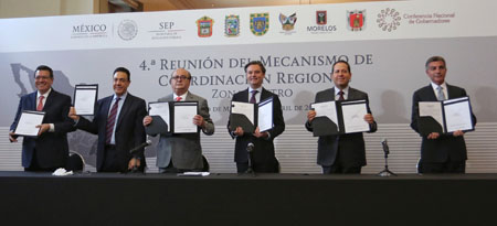 Acompañado de sus homólogos del Estado de México, Eruviel Ávila; Hidalgo, Omar Fayad y Tlaxcala, Marco Mena; el Ejecutivo reiteró su compromiso para seguir trabajando de manera coordinada con los tres órdenes de gobierno, con el objetivo de impulsar la educación en el estado. Destacó que en Puebla se realizan acciones para mejorar la calidad de la enseñanza con el equipamiento tecnológico de los preescolares, la entrega gratuita de uniformes y la incorporación de la materia de civismo. En el marco de este encuentro regional se firmó un acuerdo entre la Secretaría de Educación Pública y los gobernadores del Estado de México, Puebla, Morelos, Hidalgo y Tlaxcala, para avanzar en los procesos de implementación de la Reforma Educativa, en el que destacan los siguientes puntos: 1.- Impulsar la implementación del nuevo Modelo Educativo y las estrategias que se derivan como los programas nacional de inglés, de formación continua de docentes, las políticas para la mejora de la equidad y la inclusión educativa, de fortalecimiento y transformación de las escuelas Normales y de arte y cultura.