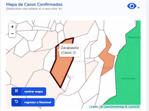 1.- Teziutlán, una defunción, 3 casos confirmados, 18 negativos y 2 sospechosos. 2.- Zautla una defunción, 1 caso confirmado, 4 negativos y 1 caso sospechoso. 3.- Zacapoaxtla, 2 casos confirmados, 2 casos sospechosos. 4.- Atempan 1 caso confirmado. 5.- Cuetzalan 1 caso confirmado, 4 negativos y 1 caso sospechoso. 6.- Xochitlán de Vicente Suárez, 1 caso confirmado. 7.- Tetela de Ocampo, 1 caso confirmado y 1 caso negativo. El mapa se va actualizado y también se reportan casos positivos en otros municipios del norte del estado como son Ixtacamaxtitlán, Chignahuapan, Huauchinango, Naupan y Xicotepec de Juárez. Por lo anterior, los Ayuntamientos han endurecido las medidas, tales como el acceso a los municipios solo con cubrebocas y en algunos se ha anunciado que personas que sean identificadas en los filtros sanitarios con síntomas de infecciones respiratorias y temperatura arriba de los 38 grados, serán canalizados de inmediato a las unidades médicas.
