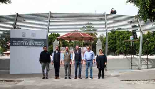 La intervención del Paseo Bravo, que se realiza con recursos municipales, consiste en la dignificación de las fuentes, monumentos, sanitarios y jardineras; así como la construcción de un pergolado en el área del kiosko. Adicionalmente, se colocará mobiliario escultórico con diseño paramétrico semejando el comportamiento de una nota musical, además de rampas, huellas guía y módulos para la actividad comercial. En el recorrido estuvieron presentes autoridades estatales y municipales.