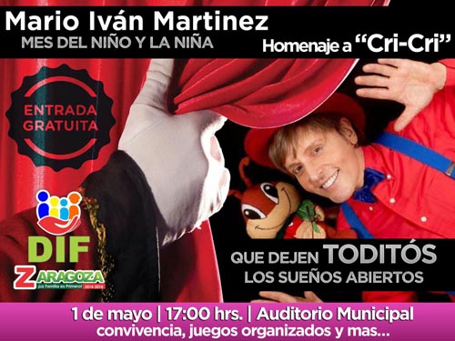 El actor Mexicano también lamentó que los adultos se obsesionen en espectáculos o series de televisión llenos de violencia y lo peor es que permiten que los vean los niños, lo que provoca en ellos una visión equivocada de la vida, tal como ocurre con los adultos que se dedican a crear cuentas falsas en redes sociales para publicar violencia, sexualidad o lanzar insultos a otras personas, eso es lo que está generando este ambiente violento en el país. La Presidenta del DIF señaló que este show se presentará a las 17:00 horas del 1 de mayo, día en que además se realizarán juegos organizados para los pequeños y lo más importante que los niños conozcan o en otros casos, recuerden las canciones de Cri-Cri, que promueven valores y se alejen un poco de las canciones de moda que promueven violencia. Por lo anterior invitó a los padres de familia de Zaragoza y municipios vecinos, que acudan a presenciar el espectáculo de Mario Iván, quien realizó sus estudios de actuación y canto en la Academia de Música y Arte Dramático en Londres Inglaterra.
