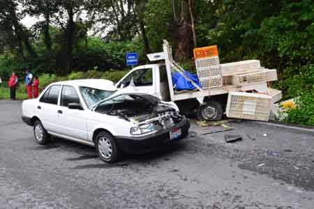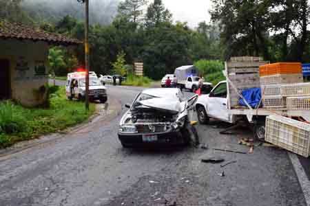 Fue cerca de las 18:30 horas de este 26 de septiembre cuando un vehículo Nissan Tsuru, modelo 2014, color blanco con placas de circulación TYD-42-47 del estado de Puebla circulaba con dirección al municipio de Huehuetla, pero al tomar la curva que se encuentra justo frente a la finca Santa María Tres Arroyos, invadió el carril contrario y se encontró de frente a la camioneta.