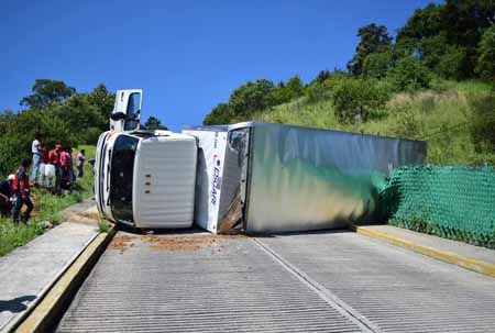 Un camión cargado con 10 toneladas de abarrotes volcó luego de