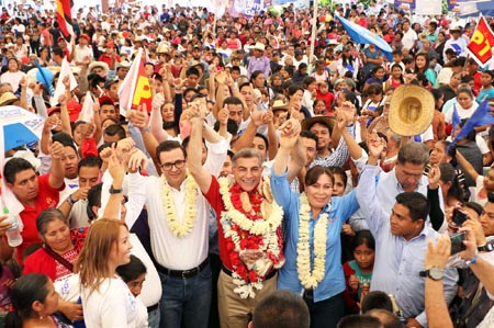 Para el campo, indicó que dará más semilla, fertilizante y un seguro para todas las cosechas, que sean afectadas por los fenómenos meteorológicos y establecerá 15 módulos de maquinaria agrícola en todo el estado para contribuir al desarrollo de los campesinos. Previo al evento, el candidato caminó por las calles de este municipio, donde los habitantes se sumaron, como muestra de apoyo, al proyecto que encabeza. Al evento asistieron los legisladores federales Juan Pablo Piña, Hugo Alejo y Miguel Ángel Huepa; los diputados locales Corona Salazar y Mario Rincón, así como el ciudadano Antonio Vázquez, entre otros.