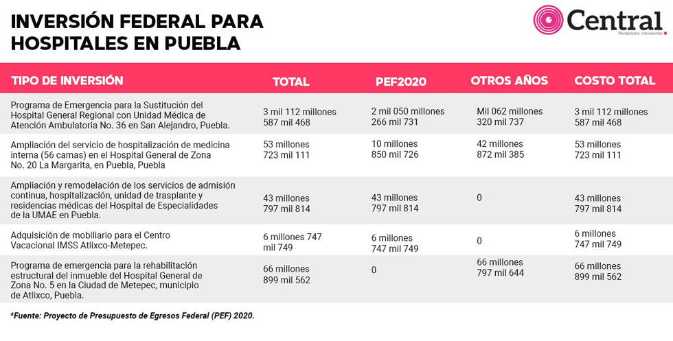 Periódico CENTRAL revisó los proyectos de inversión contemplados en el PEF2020 y se pudo corroborar que solo se tiene contemplada la inversión para dos de los cuatro hospitales que se construirán en la entidad, tal como ya lo había adelantado el Instituto Mexicano del Seguro Social (IMSS). Los dos proyectos que quedaron fuera, al menos para este 2020, son la construcción del hospital regional de Cholula, en el polémico edificio CIMA, y otro en Amozoc, con 260 camas cada uno. En septiembre, el gobierno federal anunció que el presupuesto para el San Alejandro y el hospital de la Margarita para el próximo año sería de 2 mil 134 millones 677 mil pesos. Sin embargo, el PEF2020 contempla solo 2 mil 061 millones 117 mil pesos para este rubro. De esta manera, se puede corroborar que el gobierno de AMLO recortó 73 millones 559 mil 834 pesos para la construcción de dichos hospitales. Según el proyecto, para la sustitución del Hospital San Alejandro se van a invertir 2 mil 050 millones 266 mil 731 pesos para el próximo año; mientras que para el de la Margarita serán 10 millones 850 mil 726 pesos. Otros proyectos En el PEF2020 también están etiquetados 43 millones de pesos para la ampliación y remodelación de los servicios de admisión continua, hospitalización y unidad de trasplante del Hospital de Especialidades de la UMAE en Puebla. Asimismo, 6 millones 747 mil 749 para la compra de mobiliario para el Centro Vacacional IMSS Atlixco-Metepec. (Periódico Central).
