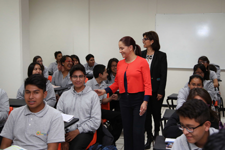 En compañía del director general del SEDIF, Jorge David Rosas Armijo, López de Gali saludó a la comunidad académica y recorrió los salones, laboratorio, biblioteca y comedor de esta escuela de bachillerato donde asisten jóvenes de zonas marginadas, así como algunos beneficiarios de programas sociales.
