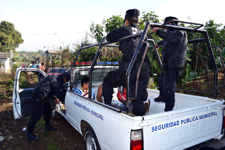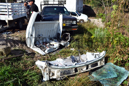 En un terreno ubicado en la Privada de la calle Juan Aldama, localizaron a Silverio Guzmán N. de 33 años de edad  y su hijo menor de edad, ambos con domicilio en la colonia Moragco de esta junta auxiliar, además de Miguel Lindero N. de 33 años con domicilio en la sección segunda de Xalacapan, quienes trabajaban en el desmantelamiento de la camioneta.