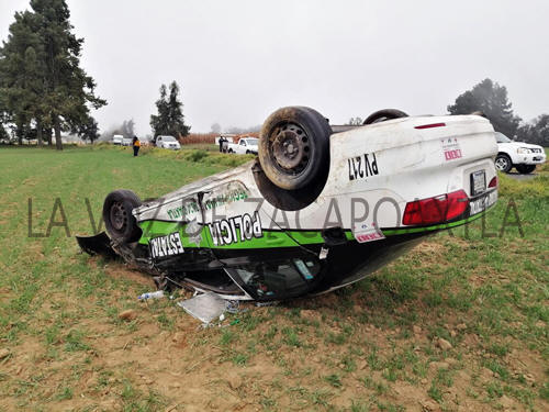 Se informó que el vehículo oficial número 217, circulaba con dirección a Zacapoaxtla, para atender un accidente que reportaron sobre esta misma carretera, sin embargo al llegar al paraje San Isidro, golpeó a una camioneta marca Nissan que ingresaba hacía Huichautla, lo que provocó que perdiera el control. Tras el impacto, el conductor de la patrulla perdió el control, salió de la cinta asfáltica y el vehículo terminó volcado sobre un terreno de siembra, hasta donde arribaron paramédicos del Sistema de Urgencias Médicas Avanzadas (SUMA). La patrulla y los oficiales pertenecen a la delegación de vialidad estatal con sede en Zacapoaxtla y fueron elementos de la delegación Tlatlauquitepec los que tomaron conocimiento y con el respaldo de grúas, llevaron a cabo el rescate de la unidad oficial.