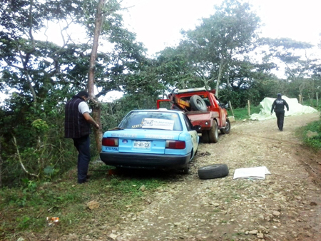 El primer taxi marca Nissan, tipo tsuru, fue encontrado en Chicueyaco, perteneciente a la junta auxiliar de Acaxiloco, el cual pertenece al sitio San Miguel Tenextatiloyan del municipio de Zautla, con placas de circulación 8761-SSK, con número de concesión 30904, el cual fue robado el pasado 25 de enero en Tlatlauquitepec, donde de acuerdo al reporte policiaco, sujetos armados amagaron al chofer y se llevaron la unidad.