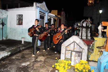 Minutos después de las 21:00 horas, un mariachi recorrió el panteón y algunas de las personas solicitaron que les cantaran melodías que eran del gusto de sus familiares, por lo que recorrieron las tres secciones del panteón.
