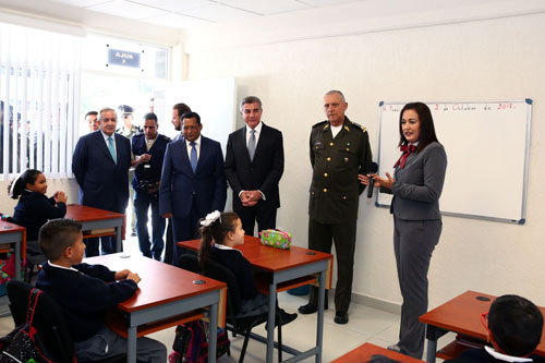 Reconoció al titular de la Sedena por ser un aliado estratégico en el desarrollo económico de Puebla, gracias a la llegada de la Industria Militar, que ha propiciado la creación de empleos y vivienda, así como mayor seguridad. También subrayó la coordinación con el Ejército Mexicano para combatir de manera frontal a la delincuencia, a fin de garantizar la tranquilidad de la población. Celebró el apoyo de las Fuerzas Armadas en la difusión de valores, a través del programa “Jueves Cívico”, así como en las jornadas y tareas de proximidad en las poblaciones de alta incidencia delictiva, y por su labor durante la contingencia originada por el sismo del 19 de septiembre de 2017. El Director General de Seguridad Social Militar, Ariel García, informó que el CENDI cuenta con tres salas para lactantes, tres espacios para maternal, nueve aulas de preescolar y una sala de cómputo. Detalló que la primaria se integra por tres edificios de dos niveles con 23 salones, una biblioteca, áreas deportivas, administrativas y un centro de computación. En el acto estuvieron presentes el Secretario General de Gobierno, Diódoro Carrasco; el Comandante de la 25 Zona Militar, Raúl Gámez; el alcalde de Puebla, Luis Banck; la Directora Académica de la Dirección General de Desarrollo de la Gestión e Innovación Educativa federal, Alejandra Rodríguez; los secretarios de Educación Pública, Ignacio Alvízar; de la Contraloría, Rodolfo Sánchez, y de Finanzas y Administración, Enrique Robledo. También el Comandante de la VI Región Militar, José Luis Sánchez y las directoras del CENDI Número 9, Niños Héroes de Chapultepec y de la primaria Vicente Suárez Ferrer, Lilia Vicente y Rocío Rocha, respectivamente, entre otros invitados especiales.