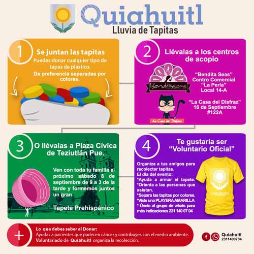 En rueda de prensa los organizadores señalaron que el objetivo de reunir el plástico, es enviarlo al banco de Tapitas, de donde actualmente se apoyan los tratamientos contra el cáncer de más de 50 niños de diversos estados de la República, dos de ellos, Luis Ángel de 16 años y Diego de tres años, quienes enfrentan la leucemia. Por esta razón se convocó a los ciudadanos de Teziutlán y la región, para que acudan a la plaza cívica el ocho de septiembre, en donde con apoyo del pintor y muralista profesional Raúl Díaz, se busca elaborar un tapete con las tapitas, actividad para la cual realizaron la invitación a los ciudadanos para que se unan a la causa, ya que se pretende que se unan al menos 200 voluntarios. Se recordó que en el mes de abril se llevó a cabo una recolección de tapitas para la misma causa y se lograron reunir un mil 765 kilos, es decir cerca de dos toneladas, pero para esta ocasión se espera superar esa cantidad, para lo cual se establecieron centro de acopio en el IMSS de esta ciudad, uno más en la Casa del Disfraz, ubicada en la calle 16 de septiembre y uno más en el centro comercial La Perla, a un costado de la catedral. La agrupación Expresiones culturales “Moria”, anunció que del 26 al 30 de septiembre, llevarán a cabo cinco funciones en el teatro Victoria de esta ciudad y parte de los recursos que se recaben en las entradas, serán entregados a las familias de los dos menores, para que se apoyen en los gastos de traslado hacia los hospitales en donde les practican las quimioterapias.