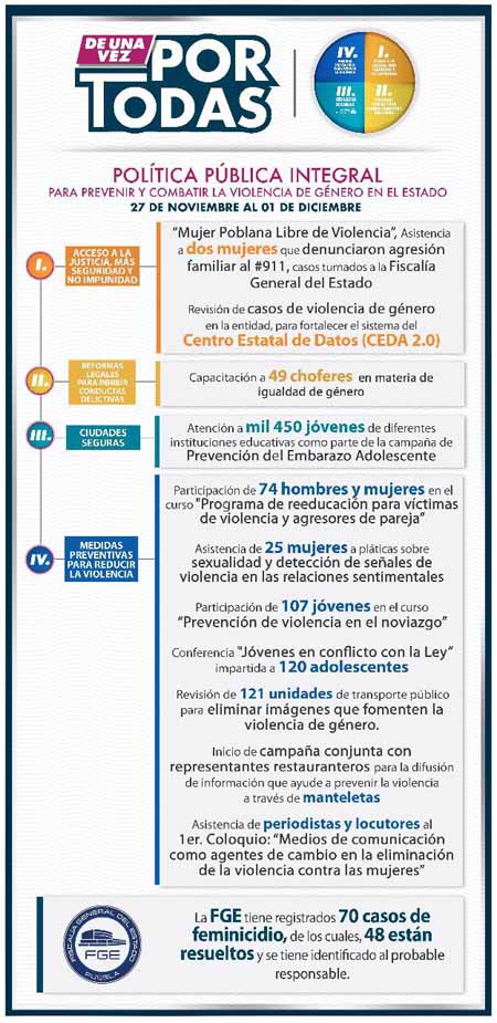 Eje 1 (Acceso a la justicia, más seguridad y no impunidad): La Unidad de Atención Inmediata de la Secretaría de Seguridad Pública (SSP) “Mujer Poblana Libre de Violencia”, asistió a dos mujeres que denunciaron agresión familiar al número de emergencia #911. Como lo marca el protocolo, los casos fueron turnados a la Fiscalía General del Estado (FGE) para ofrecer la pertinente asesoría legal y psicológica. En este sentido, el equipo de la SSP y sus enlaces jurídicos llevan a cabo una revisión permanente de los casos de violencia de género en la entidad, para fortalecer el sistema del Centro Estatal de Datos (CEDA 2.0). El perfeccionamiento de este acervo informativo ayuda en el cumplimiento de la cuarta sugerencia de las ocho que realizó Conavim. Eje 2 (Reformas legales para inhibir conductas delictivas): Derivado de la entrada en vigor de la Reforma a la Ley del Transporte para endurecer los filtros de seguridad e inhibir los casos de violencia y acoso contra mujeres en el transporte público, la Secretaría de Infraestructura, Movilidad y Transportes (SIMT) dio capacitación a 49 choferes en materia de igualdad de género. Estos cursos son parte del cumplimiento de la segunda sugerencia de Conavim. Eje 3 (Ciudades seguras): El Ayuntamiento de Puebla Capital continúa con la intervención en instituciones educativas con motivo de la Campaña de Prevención del Embarazo Adolescente. Esta semana se atendió a mil 450 jóvenes de la Telesecundaria Federal "General Lázaro Cárdenas", la Escuela Secundaria Juan C. Bonilla y los Bachilleratos Campa Tlanesi y Emperador Cuauhtémoc. Eje 4 (Medidas preventivas para reducir la violencia): Siguiendo con el esfuerzo conjunto para inhibir la violencia al interior de las familias o en las relaciones de noviazgo, la Secretaría de Salud Estatal (SSEP) en coordinación con el Sistema Estatal DIF (SEDIF), continúa brindando el curso “Programa de reeducación para víctimas de violencia y agresores de pareja”, que esta semana fue impartido a 34 hombres y 40 mujeres. De la misma forma, 25 mujeres asistieron a pláticas referentes a una sexualidad sana y cómo detectar señales de violencia en las relaciones sentimentales y 107 jóvenes participaron en el curso “Prevención de violencia en el noviazgo”. Por parte de la Secretaría de Educación Pública se impartió la conferencia “Jóvenes en conflicto con la Ley” impartida a 120 adolescentes. Las conferencias impartidas por SSEP, SEDIF y SEP contribuyen al cumplimiento de la quinta sugerencia de Conavim. Como medida adicional para inhibir la violencia de género, la SIMT continúa con el retiro de toda aquella calcomanía o etiquetas alusivas a la violencia de género en unidades del transporte público o mercantil. Durante esta semana se sometieron a revisión un total de 121 unidades de 8 rutas de la zona metropolitana y taxis en general. Como complemento de las tareas de prevención, el Instituto Poblano de las Mujeres (IPM) inició una campaña conjunta con los representantes de la industria restaurantera para difundir información que ayude a prevenir la violencia contra las mujeres y las niñas, a través de manteletas informativas que los empresarios del sector colocarán a los comensales. Aunado a esto, en conjunto con la Dirección General de Puebla Comunicaciones y la Coordinación de Asuntos Jurídicos del Instituto Nacional de las Mujeres, el IPM convocó esta semana a periodistas y locutores en el 1er. Coloquio: “Medios de comunicación como agentes de cambio en la eliminación de la violencia contra las mujeres” para sensibilizar a los representantes de medios sobre cómo comunicar con perspectiva de género, lenguaje incluyente y no sexista. La FGE tiene registrados 70 casos de feminicidios, de los cuales, 48 están resueltos y se tiene identificado al probable responsable. En Puebla “De una Vez Por Todas” coordina esfuerzos por una vida libre de violencia para las mujeres.