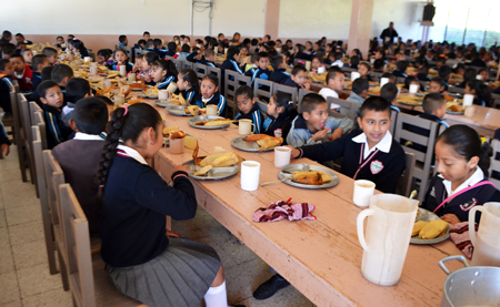 También añadió que la alimentación de los alumnos se basa en el plato del buen comer, con la preparación de platillos que garantizan que los niños cuenten con las cantidades requeridas de vitaminas y minerales, además de agua de frutas y la vigilancia permanente del médico escolar para el peso y talla de los alumnos.