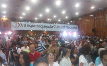 Durante la inauguración, el líder nacional de la organización social, Aquiles Córdova Morán, afirmó que “nosotros proponemos y exigimos que la cultura sea una cultura crítica. No aceptamos un arte conformista, manipulador, que condene al hombre sólo a quedarse extasiado ante una obra. Antorcha ha decidido dar la batalla en ese terreno: esta Espartaqueada es una muestra viva de ello”.