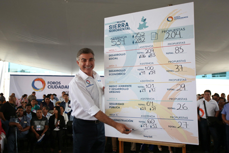 Teziutlán, Puebla.- El gobernador electo, Tony Gali, recibió 204 propuestas en los Foros Ciudadanos, realizados en esta región con la participación de 534 asistentes, a quienes reiteró que el sello de su gestión será la cercanía social.