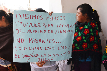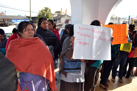 Un grupo de 60 personas, en su mayoría madres de familia con cartulinas con leyendas como “Exigimos médicos titulados, no pasantes”, arribaron a las 8:30 horas de este jueves al edificio sede de la jurisdicción sanitaria y externaron que desde hace seis años no cuentan con médico de base y de manera aislada cuentan con el servicio de médicos pasantes. Lucía Contreras Ramírez señaló que desde los primeros días de febrero de este año, se quedaron una vez más sin médico porque terminó el tiempo de residencia del pasante, por lo que tienen más de un mes con la unidad solo con personal de enfermería y sin servicio de consulta para mujeres embarazadas, niños con desnutrición y personas con enfermedades crónicas.
