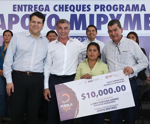 Informó que las MiPyMEs generan el 73% del empleo en México, por lo que resaltó la importancia de contar con políticas de estado que beneficien a los emprendedores y, con ello, más personas puedan ser dueñas de su propia economía. El Secretario de Competitividad, Trabajo y Desarrollo Económico, Jaime Oropeza, detalló que con una inversión de 5 millones de pesos, el gobierno del estado, en coordinación con el INADEM y la Delegación de la Secretaría de Economía en Puebla, colaboran para atender hasta 500 negocios siniestrados con cheques de 10 mil pesos por empresa. Estuvieron presentes el Coordinador para la Reconstrucción, Eugenio Mora; el delegado federal de la Secretaría de Economía, Juan Pablo Jiménez; el delegado federal de Nacional Financiera, José Luis Flores; el Presidente del Consejo Coordinador Empresarial, Carlos Montiel; el director general de Programas de Sectores Estratégicos y Desarrollo Regional del INADEM, Rolando Zubirán y la Coordinadora de Proyecto de Apoyo a la Recuperación Post Sismo y representante del Programa de las Naciones Unidas para el Desarrollo, Mónica Martínez; autoridades de los tres órdenes de gobierno, presidentes municipales y beneficiarios.