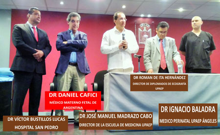 Estuvieron presentes el Doctor Daniel Cafici, médico Gineco obstetra con subespecialidad en Medicina materno fetal, autor de libros y publicaciones de gran interés en la materia, también estuvieron de invitados el Fiscal Estatal para la prevención de Muerte materna, el Doctor Bernardo Carrillo Barocio, del Hospital español de México, además del Doctor Héctor Oviedo Cruz, jefe del Centro Materno Fetal (Cemafe) y del estado de Puebla. Se contó con la presencia de los representantes del departamento de materno fetal del Hospital San Pedro, el Doctor Víctor Manuel Bustillos Lucas y el Doctor Carlos Manuel Olmos Fernández, este último responsable del departamento de Ecografia de alta especialidad para la detección de malformaciones fetales, preeclampsia y restricción en el crecimiento fetal