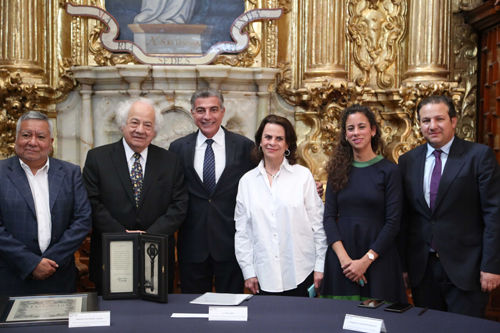 9 Diciembre 2018 Puebla.- El gobernador Tony Gali otorgó la Clavis Palafoxiana al maestro Fernando Lozano, director de la Filarmónica 5 de Mayo, por su vida dedicada a las artes así como por su interés en la difusión de las expresiones artísticas de Puebla. En este evento, en el que también estuvieron presentes el Secretario de Cultura y Turismo, Roberto Trauwitz y el Subsecretario de Cultura, Moisés Rosas, se reconoció al maestro Lozano por su trayectoria como promotor cultural, músico y compositor.