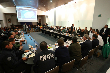 En tanto, el delegado de la Comisión Nacional del Agua (CONAGUA), Alberto Jiménez, dio a conocer que las presas del estado que se encuentran saturadas, están siendo desfogadas y que se mantiene el abastecimiento de agua potable en las comunidades que así lo requieren. En el encuentro participaron el alcalde de la capital, Luis Banck e integrantes del gabinete estatal, así como representantes de los tres niveles de gobierno.