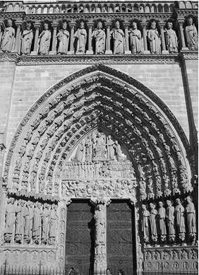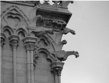 Detalle del portal del juicio final de la catedral de Notre Dame de Paris El portal de la virgen está precisamente dedicado a la virgen María y el portal de Santa Ana (dedicado a la madre de la virgen) tiene una polémica representación de Cristo a quien lo sostiene un obispo y un rey que al parecer son el obispo Maurice de Sully y el rey Louis VII aunque hay versiones que estos dos personajes son imposible de identificar. Sin duda uno de los elementos más célebres del exterior son las gárgolas, esculturas colocadas en los extremos del edificio que tienen la función de drenar el agua de las lluvias. Tienen figuras de seres fantásticos y muchas veces espantosos, su construcción data de la edad media.