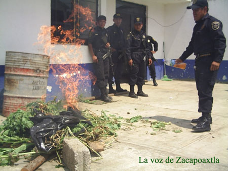 la quema de más de 300 plantas de marihuana que habían sido sembradas en la junta auxiliar de Xalacapan, las cuales